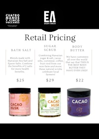 All Cuatro Manos y Cinco Volcanos products—including bath salts, body scrubs, body butters, and herbal teas—are available for purchase at EADEM ARBOR events.